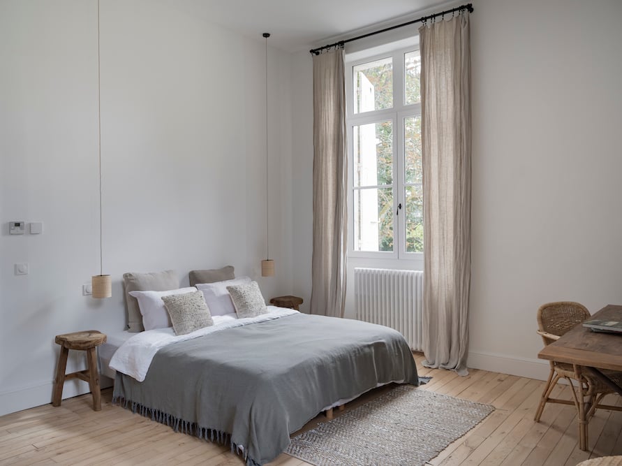 De 5 ruime kamers en suites, elk met een luxe en-suite badkamer, zijn ingericht in een elegante, kunstzinnige stijl met mooie, duurzame materialen. Denk aan witte kalkstenen muren, houten balken, zorgvuldig geselecteerde kunstwerken en een vleugje Franse nonchalance.