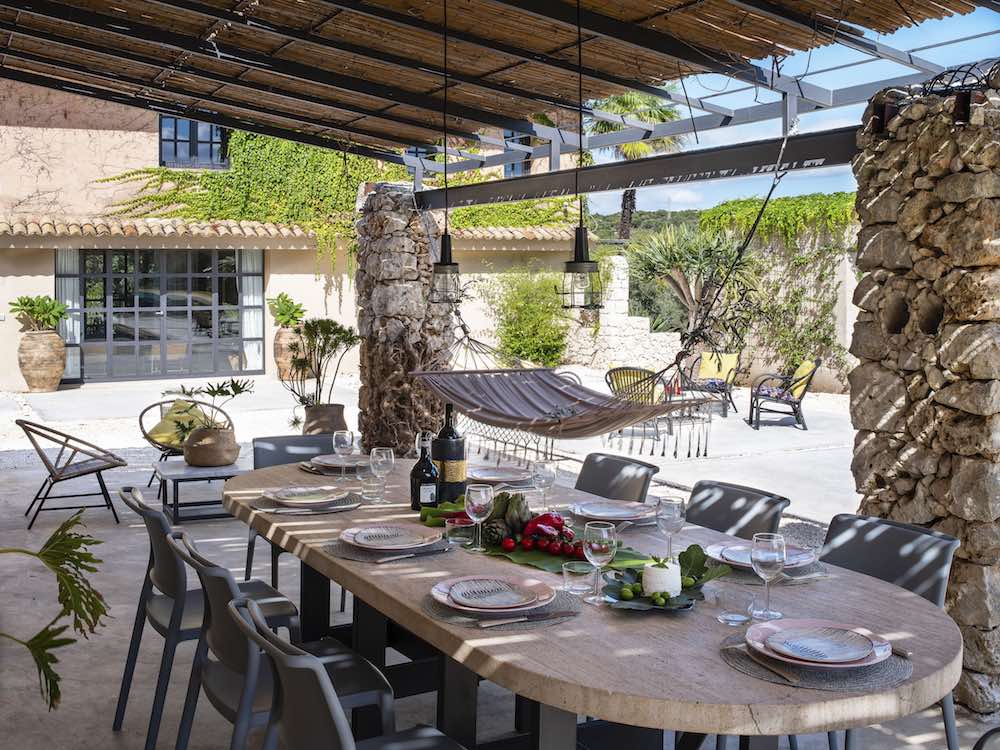 - Eetkamer met grote eettafel voor 12 personen en sfeervolle zithoek en deuren naar de patio en de tuin