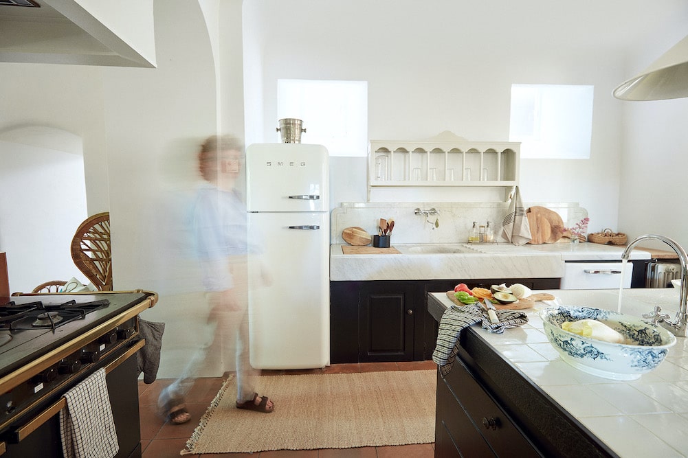 - Ruime woonkeuken met een grote open haard, eettafel, een keukeneiland en mooie apparatuur waaronder een Smeg vintage koel/vrieskast, een gasfornuis met oven, een vaatwasser, magnetron, Quooker, Espresso machine, broodrooster en waterkoker