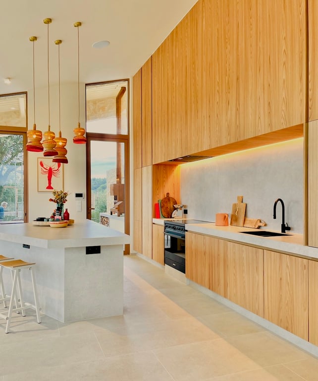 - Open living met een woonkeuken voorzien een ruime eettafel met banken en stoelen en een keukeneiland met barkrukken.