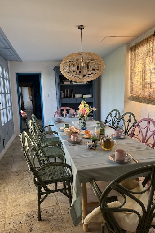 - Verderop vindt u de eetkamer met de eettafel en een knusse houtkachel.