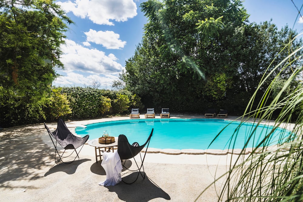 - Verderop in de tuin vindt u het ronde zwembad (met een diameter van 11 meter), comfortabele ligbedden en loungestoelen - omringd door bomen en veel groen.