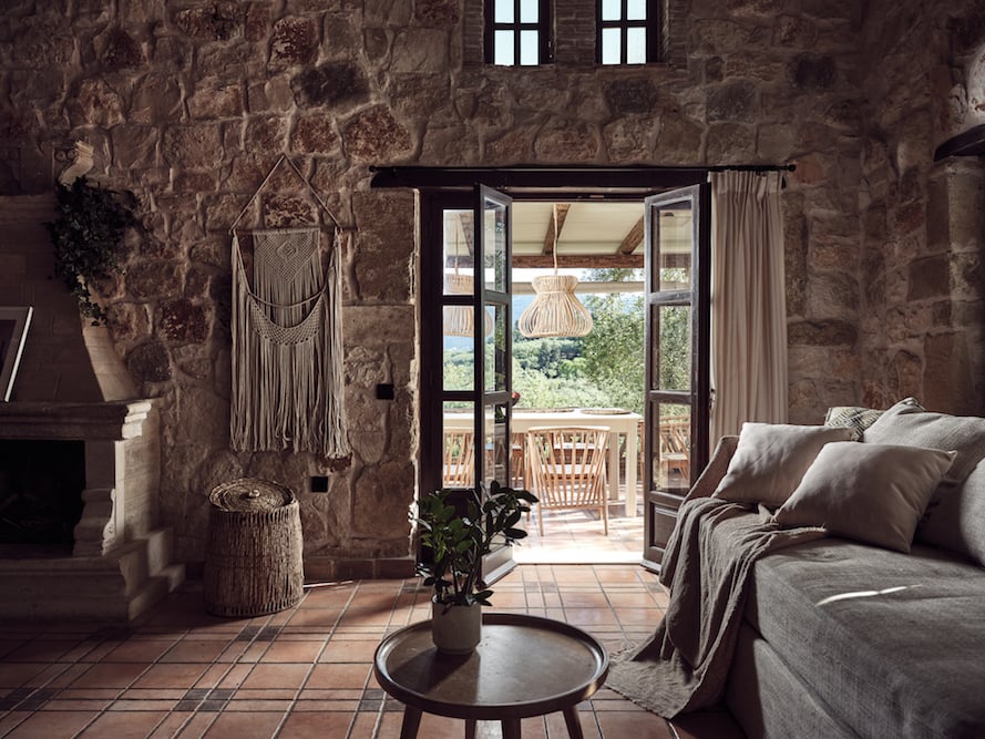 - Zeer ruime living met oude open haard, comfortabele bank en een trap naar boven.