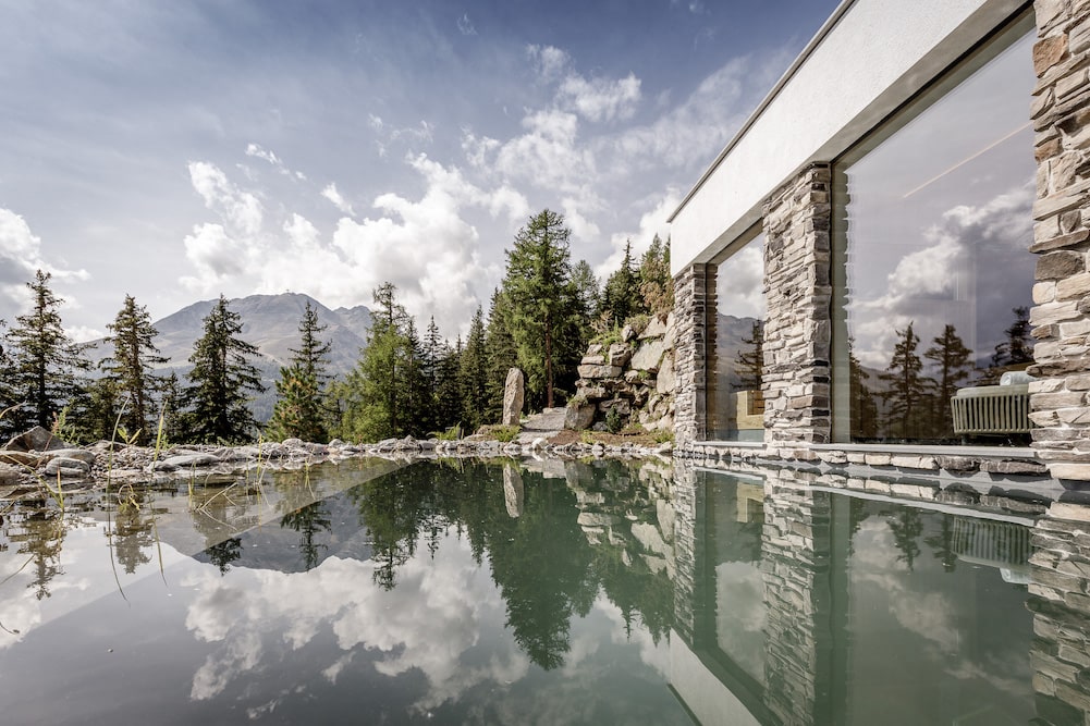 - Het natuurlijke zwembad (7m x 4m x 2m) is het hoogtepunt, dat een vijver nabootst met zachte kiezels en stenen. Het wordt verwarmd door een warmtepomp aangedreven door lucht.
