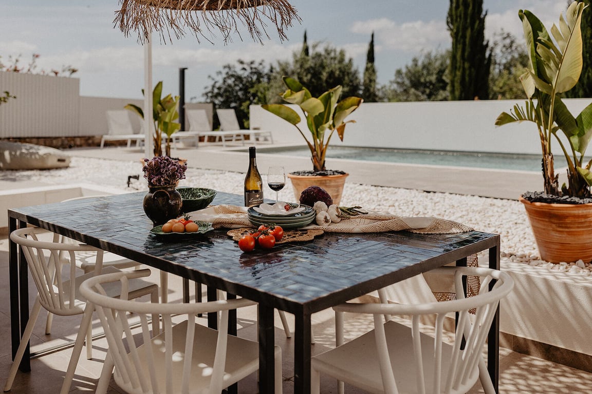 - Patio met overdekte eettafel, barbecue en open haard.