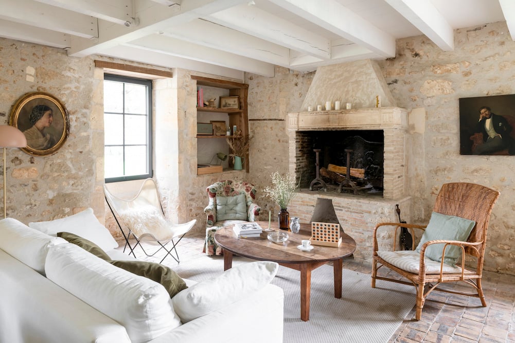 - Een sfeervolle woonkamer met een kleine ronde tafel, zithoek en een open haard