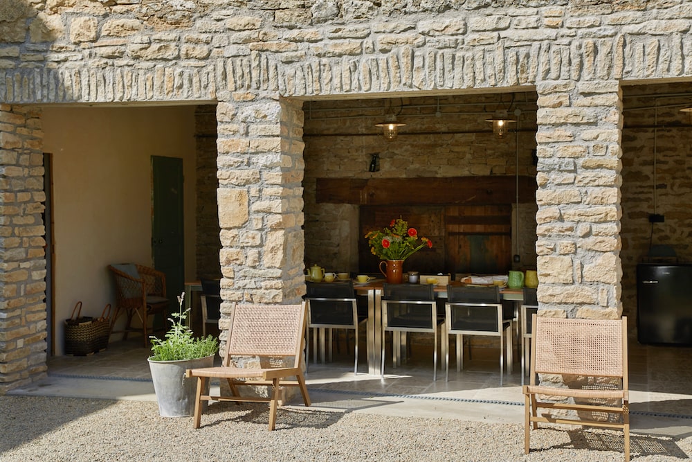 - Een goed uitgeruste landelijke keuken met een Falcon gasfornuis, vaatwasser, Amerikaanse koelkast, Nespresso-apparaat en magnetron. De keuken heeft een groot eiland en een extra eettafel.