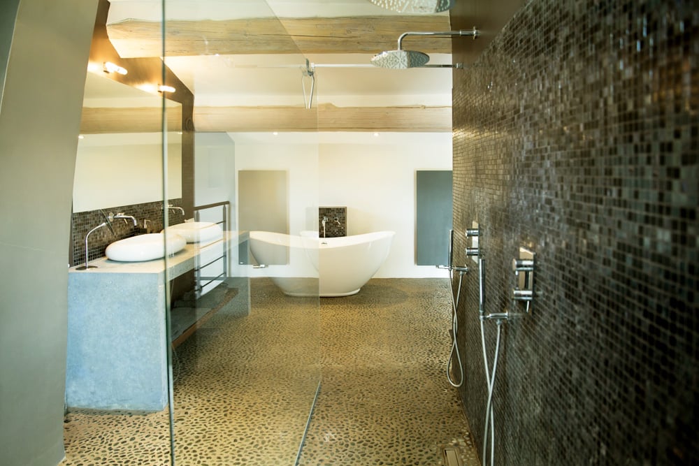 - luxe en-suite badkamer met vrijstaand ligbad, regendouche en twee wastafels