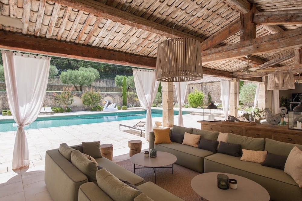 - Overdekte buitenruimte met verschillende banken, luxueuze lounge stoelen en tafel voor 24 personen. Ook is er een buitenkeuken voor het bereiden van een simpele maaltijd. Ook is er een houtskoolbarbecue en een elektrische plancha aanwezig. Het terras kan verwarmd worden op koude dagen.