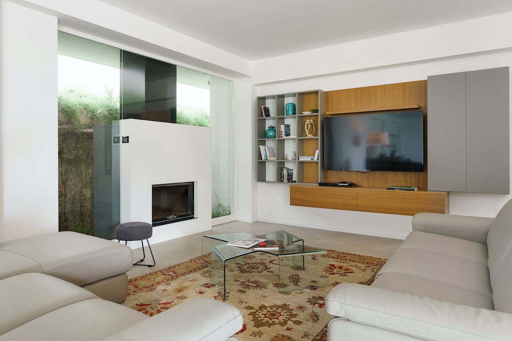- Ruime woonkamer met comfortabele zithoek, open haard, lounge stoelen en grote tv.
