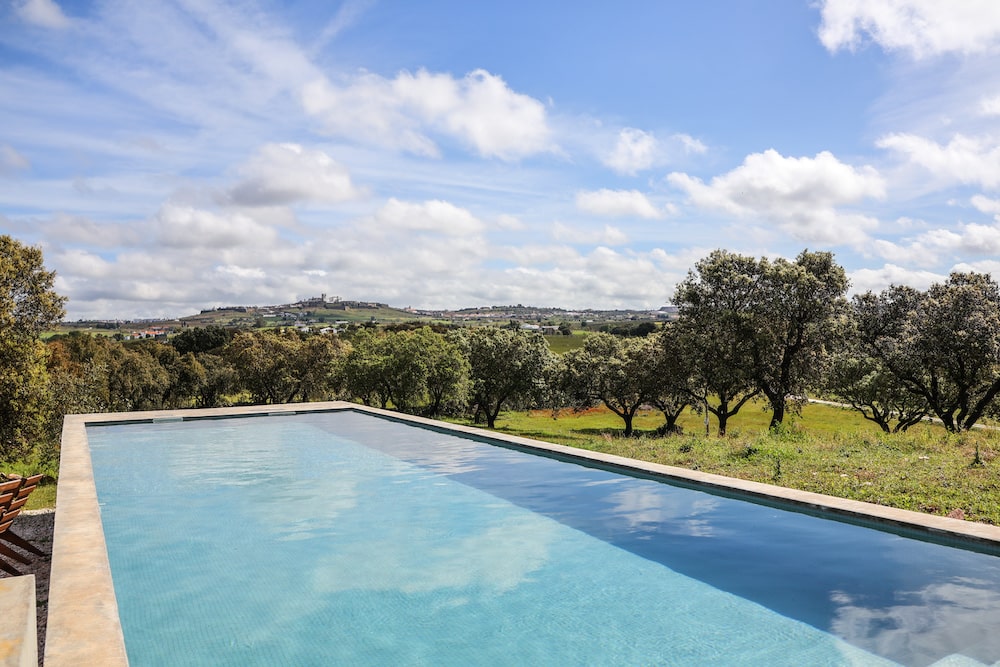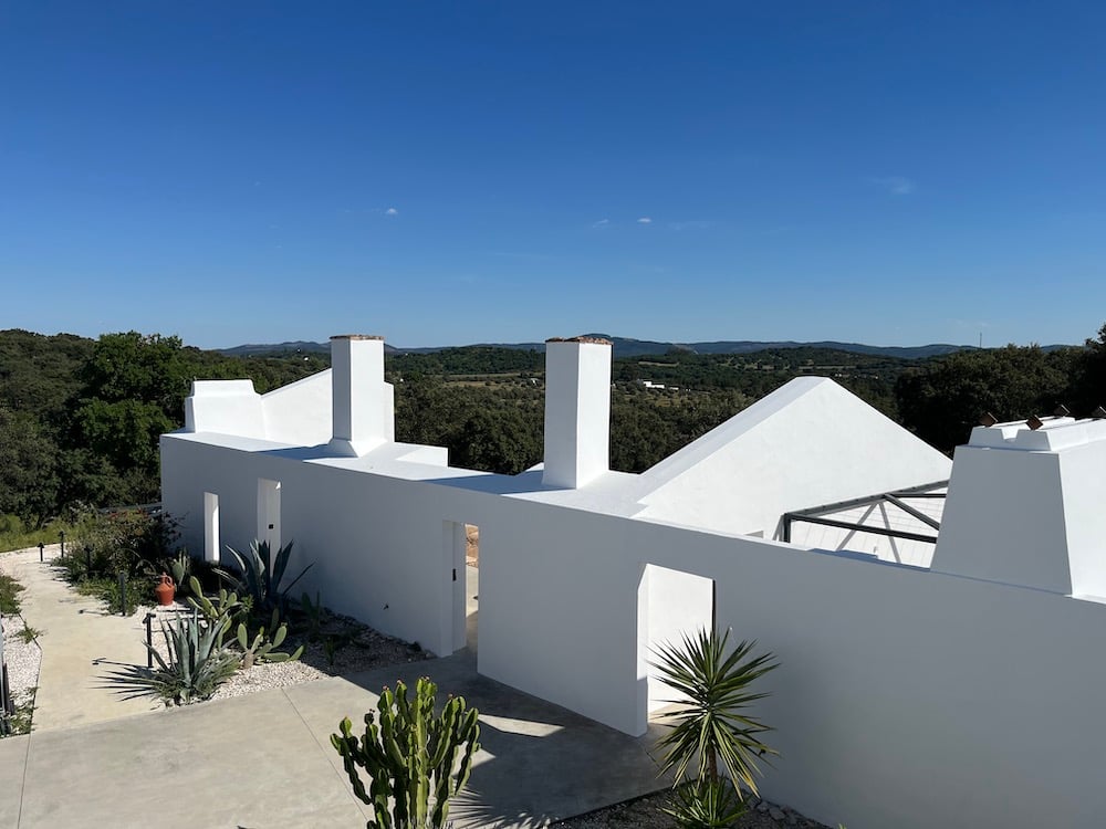 Buiten lonkt de ongerepte Alentejaanse natuur. Een 12-meter lang zwembad glinstert tussen de kurkeiken, met ligbedden en een ruime eetplek voor al-fresco lunches. Vanaf hier strekt het uitzicht zich uit tot het kasteel van Estremoz – een levend schilderij dat verandert met het uur van de dag. Monte dos Santos is meer dan een vakantiehuis. Het is een statement van eenvoud en stijl, een plek waar elk detail klopt en stilte een luxe wordt.