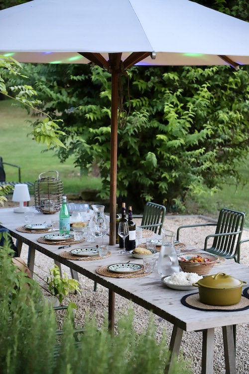 - Terras met lange eettafel en toegang tot beide keukens.