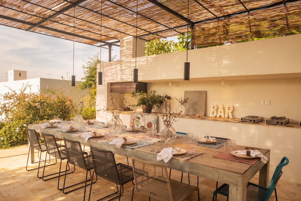 - Vanuit de keuken is er toegang tot een 30-meter lange pergola met een buitenkeuken en een eettafel voor 16 personen.