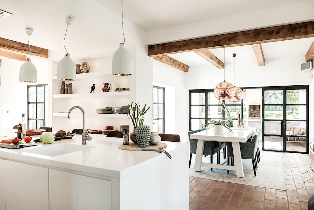 - Aansluitend op de keuken is de eetkamer waar een lange eettafel staat met stoelen en openslaande deuren naar het terras gaan.