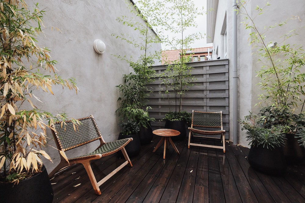 Het mooie privé terras van 15m2 is ingericht met levendige groene planten en comfortabel buitenmeubilair.