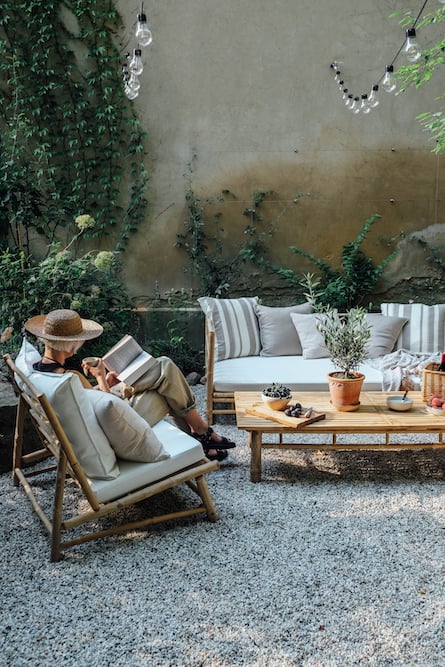 - Beschutte achtertuin met volgroeide bomen en mediterrane beplanting