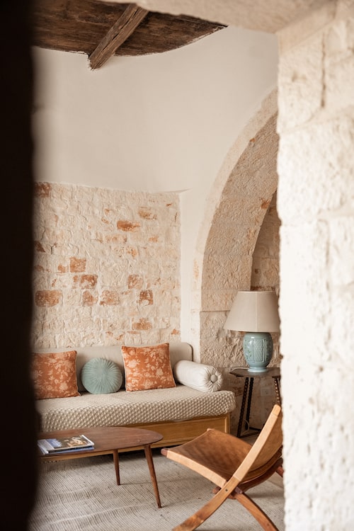 - Verderop vindt u de woonkamer, met een zitgedeelte en lange eettafel, beide met uitzicht op de tuin en het stadje Locorotondo in de verte.