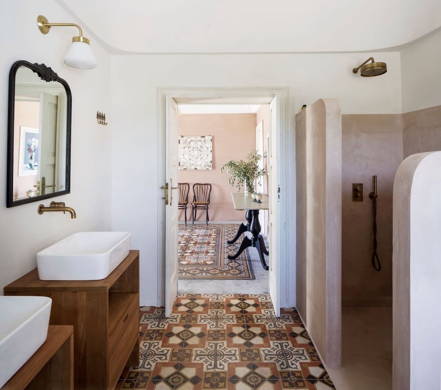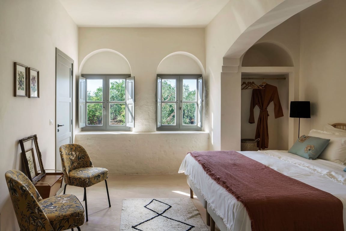 - De eerste slaapkamer vindt u in de voormalige stallen van de oude olijfoliefabriek. Deze onafhankelijke (en zeer ruime!) suite beschikt over een zitgedeelte, tweepersoonsbed (160 x 200 cm), een bureau en ingebouwde kledingkasten. Ook vindt u hier een badkamer ensuite, uitgerust met dubbele wastafel, toilet en grote inloopdouche douche.
