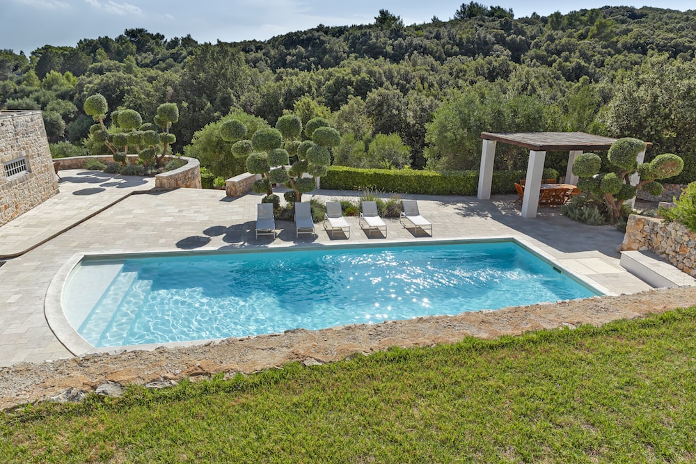 - Het zwembad (13x5m, 1,8m diep) wordt schoongemaakt met een natuurlijke zoutoplossing en heeft een warmtepomp. Er zijn verschillende ligstoelen aan de rand van het zwembad.