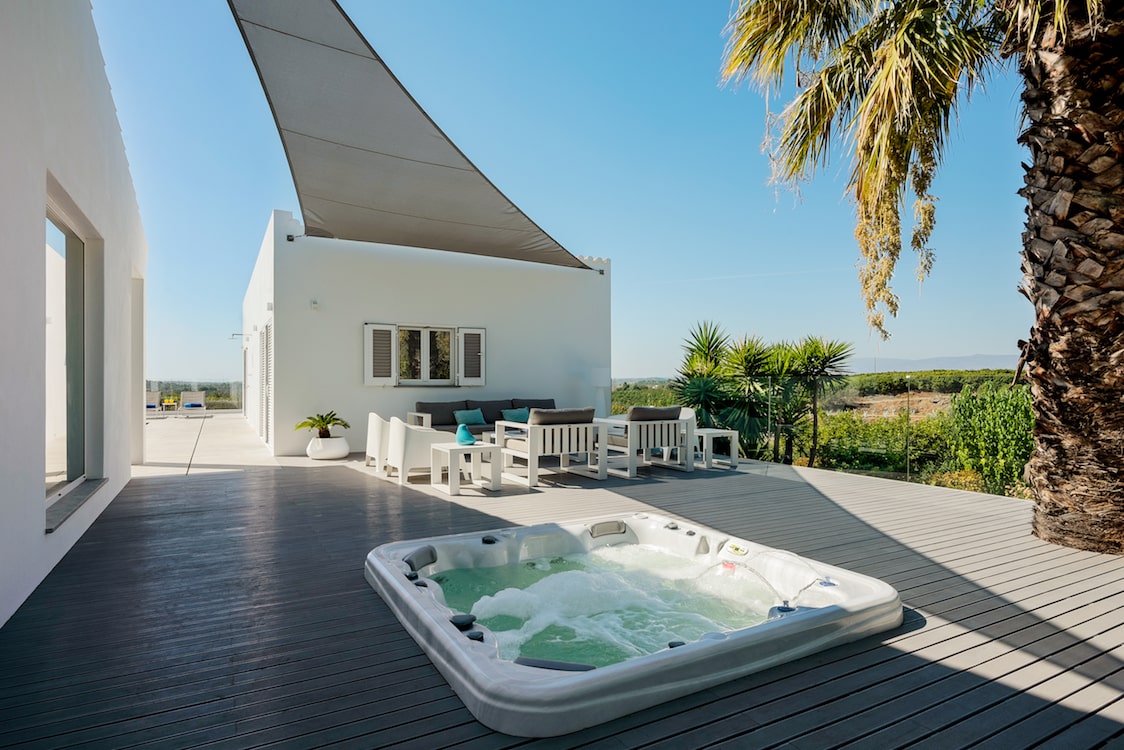 - jacuzzi met deck onder een schaduw doek