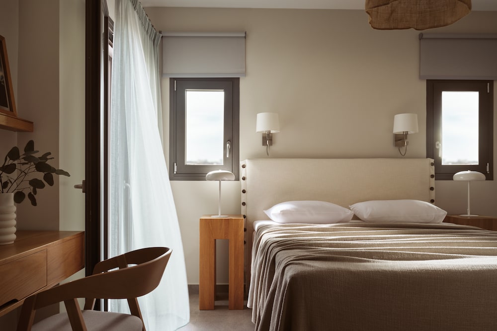 - De hoofdslaapkamer (35 m²) biedt uitzicht op zee en heeft een eigen badkamer met een jacuzzi en mooie grafische design tegels.