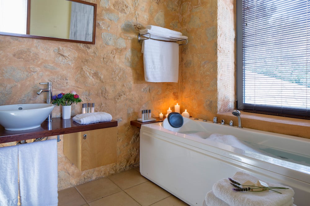 Aan de linkerkant van de ingang treft u de tweede slaapkamer aan met een tweepersoonsbed en een eigen badkamer met een hydromassage bad. Enorme openslaande deuren leiden naar de patio, direct boven het zwembad met prachtig zeezicht. Een trap in de slaapkamer brengt u naar een vliering met een bureau. Aan de rechterkant van de ingang ligt de derde (kinder)slaapkamer die op dezelfde manier is ingedeeld. Deze kamer heeft 2 bedden en op de vliering staan naast een bureau tevens nog twee bedden. In deze kamer kunnen dus in totaal 4 personen slapen. De eigen badkamer heeft een douche en een hydromassage bad. Alle kamers zijn voorzien van airconditioning.