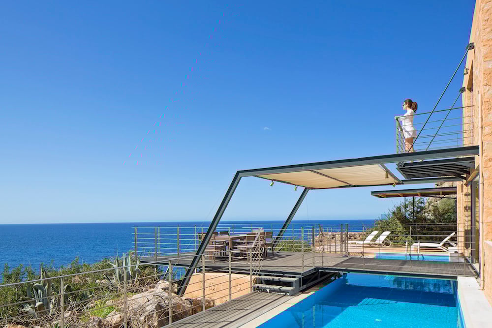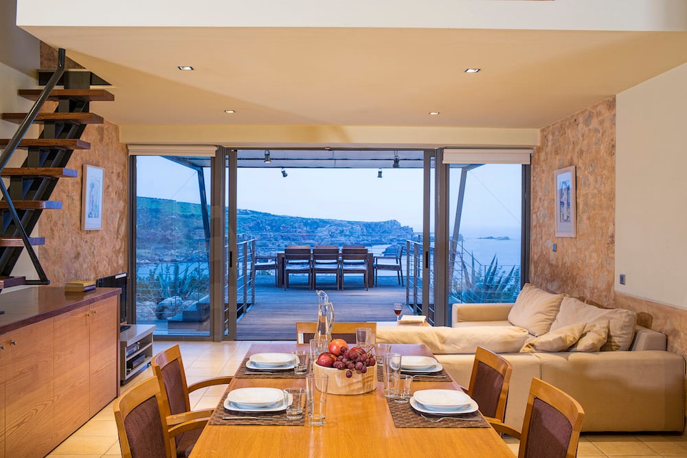 De op drie niveaus gebouwde villa heeft een open living met een comfortabele bank, een ruime eettafel voor 8 personen en grote schuifdeuren die toegang bieden tot het houten dek buiten die met een brug over het zwembad loopt. Tevens beschikt de living over een volledig ingerichte keuken met een kookeiland voorzien van vier keramische kookzones en een oven. Het keukenblok tegenover het kookeiland is voorzien van een dubbele wasbak, vaatwasser, koelkast en een Nespresso koffiemachine. Via een groot vierkante glazen raam kijkt u uit op de rotsen van de klif. De living bevindt zich direct onder een vliering waar zich een slaapkamer met een tweepersoonsbed bevindt die door twee glazen scheidingswanden met houten jaloezieën is afgeschermd. De ensuite badkamer is betegeld met groene Arabische tegeltjes. Enorme openslaande deuren aan de kant van de zee leiden naar het balkon direct boven de brug bij het zwembad.