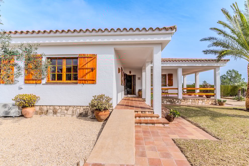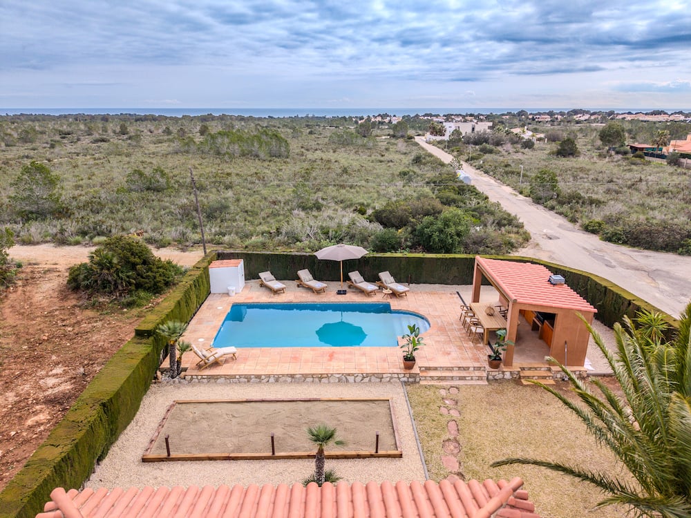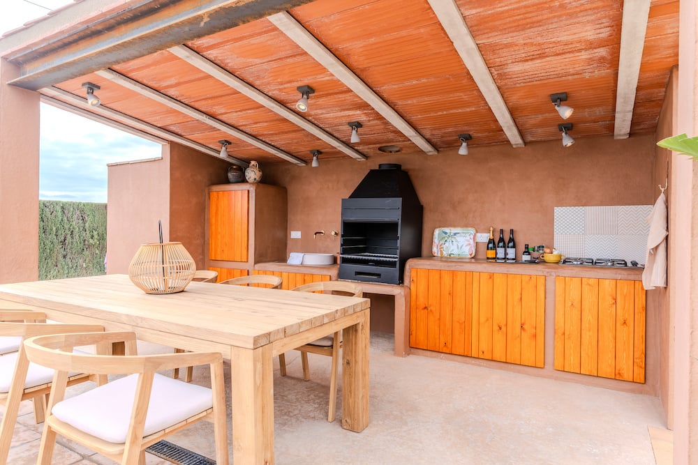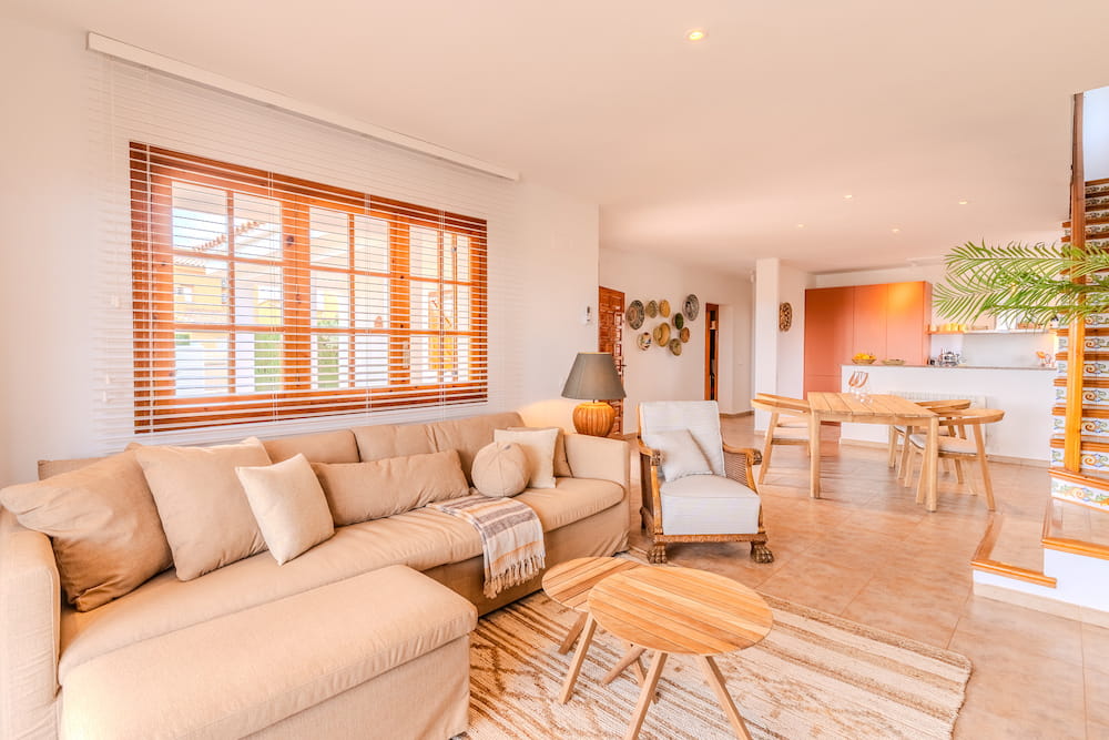 Binnen voelt het meteen comfortabel en ontspannen. Natuurlijke materialen, warme tinten en een lichte, open indeling geven het huis een rustige basis. De woonkamer met haard en grote ramen sluit mooi aan op de eetruimte en de keuken. De villa beschikt over vier sfeervolle slaapkamers, allemaal voorzien van airconditioning, en twee badkamers. Grote schuifdeuren en ramen zorgen voor veel licht en maken de verbinding met buiten vanzelfsprekend.