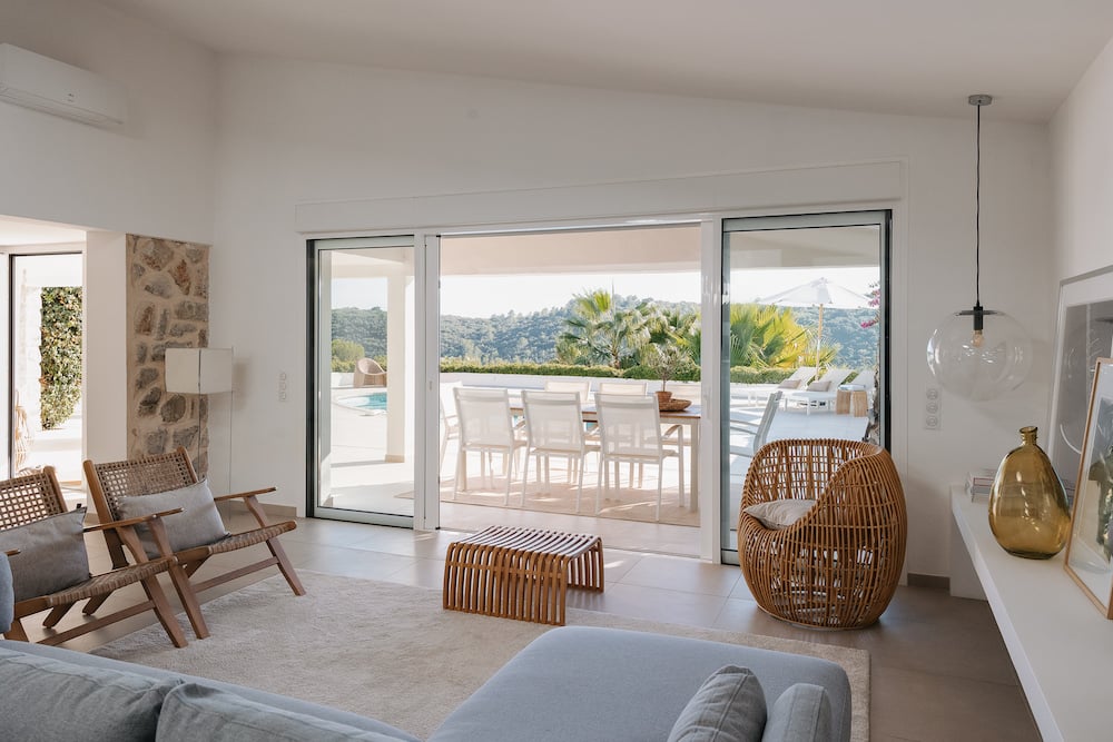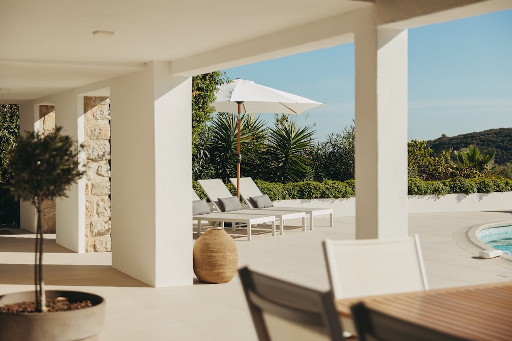 - Verschillende terrassen, met verschillende zitgedeeltes, overdekte eettafel en loungebank en ligbedden. In de tuin staan hoge palmbomen, mooie olijfbomen, cacti en planten.