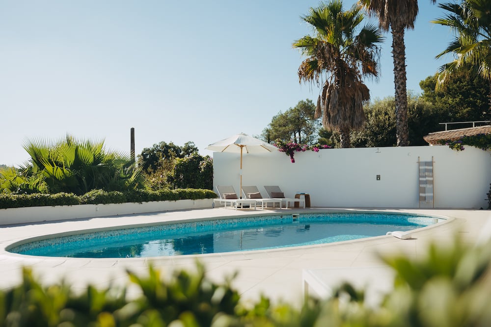 - Ovaalvormig zwembad van 9 bij 4 meter, met een maximale diepte van 2.5 meter. Het zwembad is met een alarm beveiligd met daaromheen 6 ligbedden en een buitendouche.