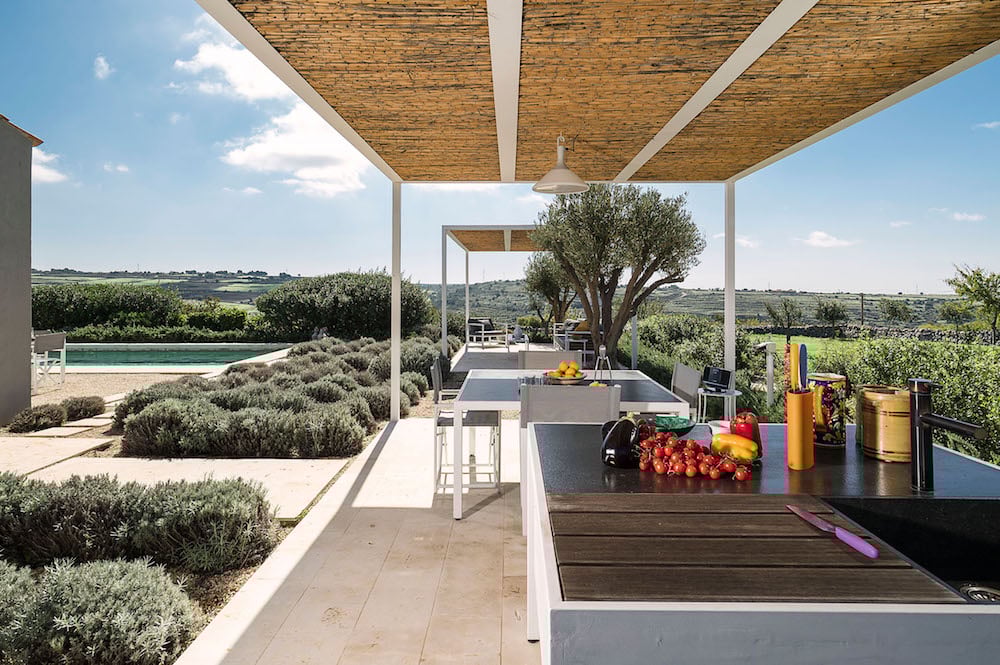 - Bij het huis liggen diverse terrassen die zijn overdekt met een mooie moderne pergola. Nabij de keuken ligt het terras met een eettafel voor 4 personen, een barbecue en een keukenblok met een gootsteen. Perfect voor een al-fresco dinner.