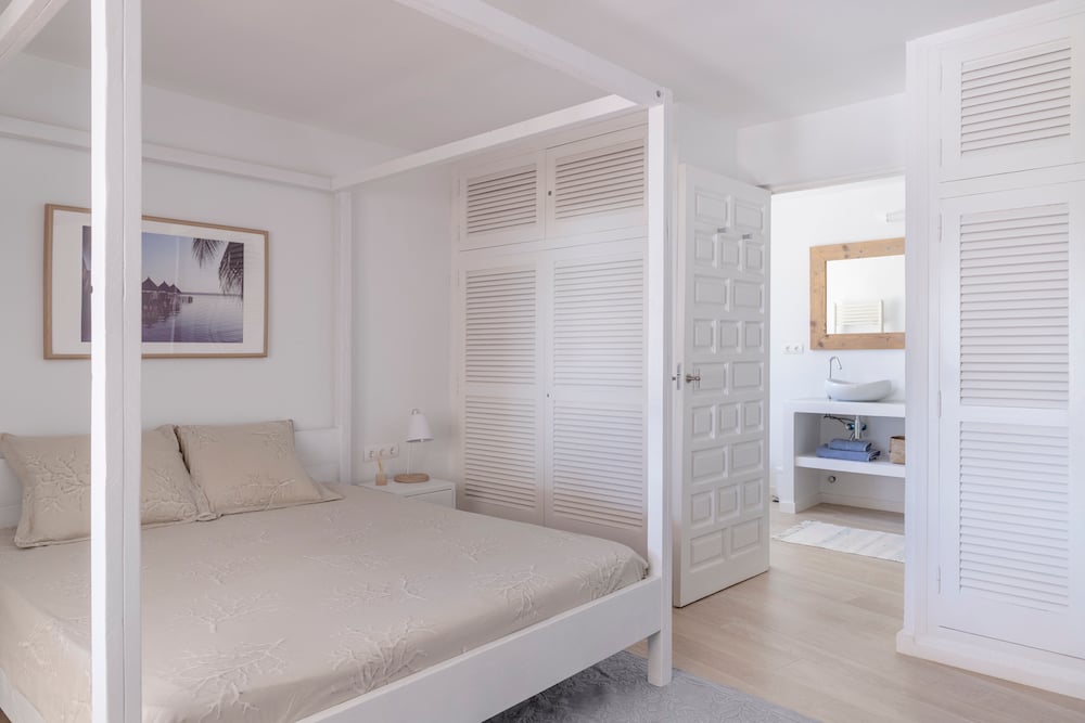 - een grote slaapkamer met tweepersoons hemelbed, veel ingebouwde kastruimte, ensuite badkamer met wastafel met dubbele wasbakken, ruime inloopdouche, toilet