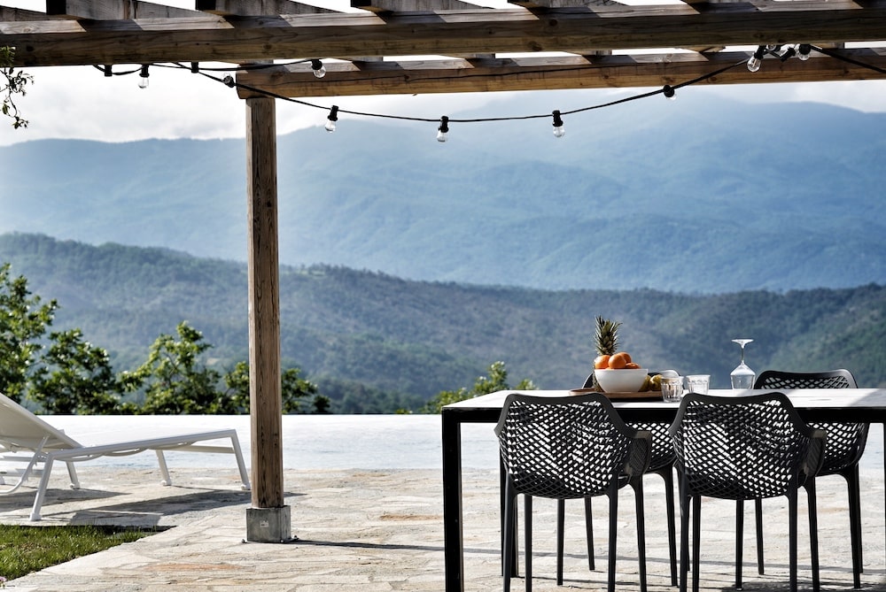 - Overdekt terras (pergola) bij het zwembad met een eettafel voor 12 personen.