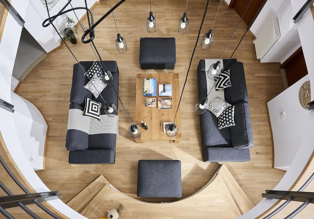 Via de trap reikend naar de eerste verdieping, wacht een tweede open zitgedeelte op je, prachtig ingericht en gevuld met licht, dankzij de grote ramen. Bovendien zijn er op dit niveau verschillende entertainment faciliteiten voor het hele gezin / groep beschikbaar, waaronder een kantoorruimte met een printer, een bioscoopkamer met Playstation 4 en 65 "HDTV met Netflix, een speelruimte voor jonge kinderen en een fitnessruimte met een hometrainer, een multifunctionele sportschool, matten, abs bank, stepper machine en yoga mat. Bovendien is er op de eerste verdieping een familie badkamer met een bad en dubbele wastafel.