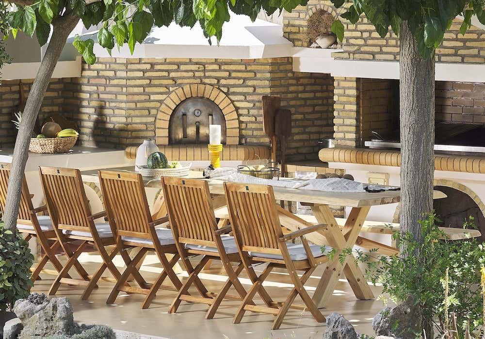 - Volledig uitgeruste buitenkeuken met houtskool BBQ, houtoven, gasfornuis, koelkast en een spoelbak.