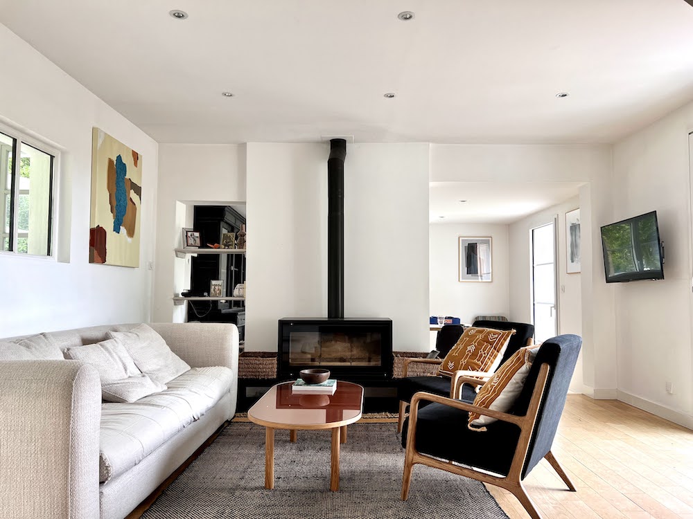 - Een woonkamer met een knusse zithoek, een houtkachel en schuifdeuren die openen naar de tuin