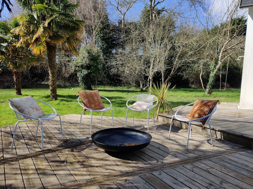 - Aan het hoofdhuis ligt een terras met een eettafel voor 12 personen en er is een tweede terras met stoelen en een vuurkorf