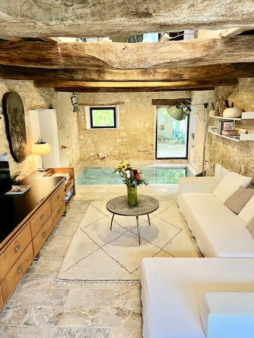 - Een mooie woonkamer met een zithoek en aansluitend een binnenzwembad