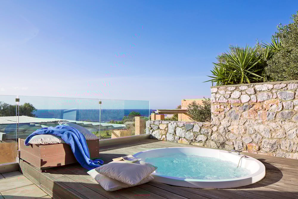 Buiten ligt het L-vormige zwembad, van 23x9m die de lengte van de villa aan de voorkant bestrijkt. Het eerste deel van het zwembad is erg ondiep waardoor het voor kleine kinderen fijn is om in te spelen. Voor kinderen is er ook een trampoline en gras om op te spelen. Voorbij het zwembad leidt een trap omhoog naar een terras met een tafel, een barbecue en comfortabele zitbanken. En een paar treden verder omhoog is een uitkijkplatform om te genieten van een panoramisch uitzicht op zee en prachtige zonsondergangen. Meer ontspannende panorama’s heeft u vanuit de jacuzzi die - volledig beschut gelegen - is ingebouwd in een verhoogd houten dek aan de zijkant van het huis.