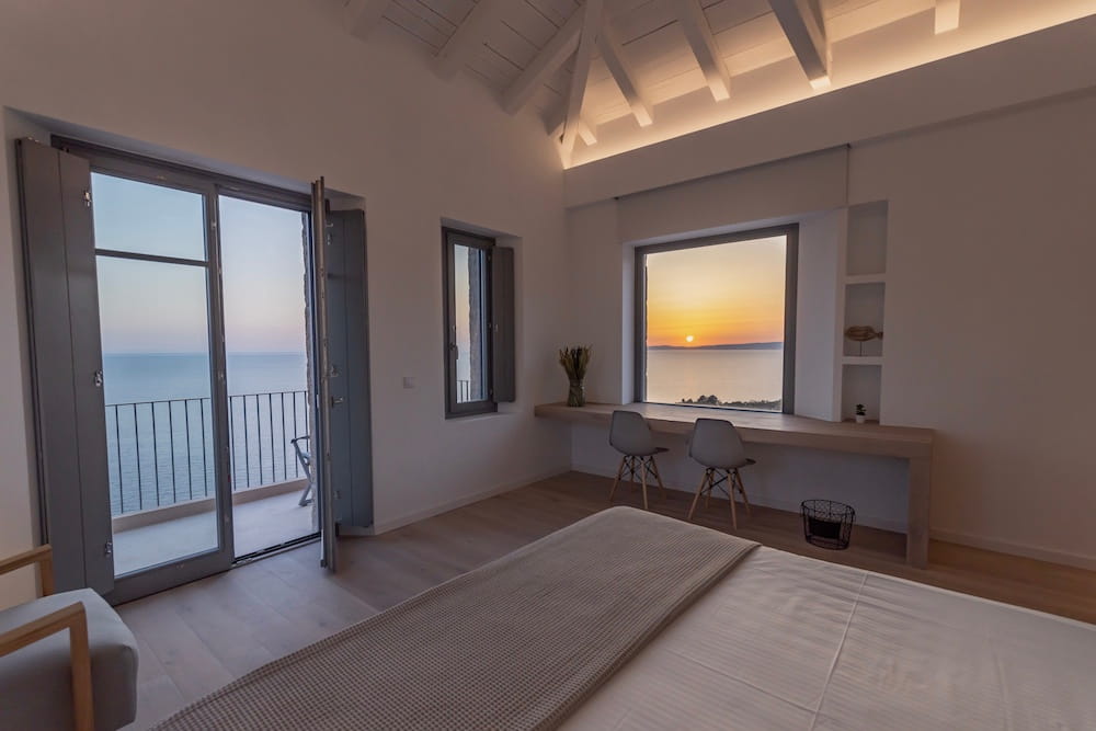 - Bovenverdieping: Elegante tweepersoonsslaapkamer met Coco-Mat matras, ensuite badkamer met inloopdouche, inloopkast, werkruimte en een privébalkon met zeezicht.