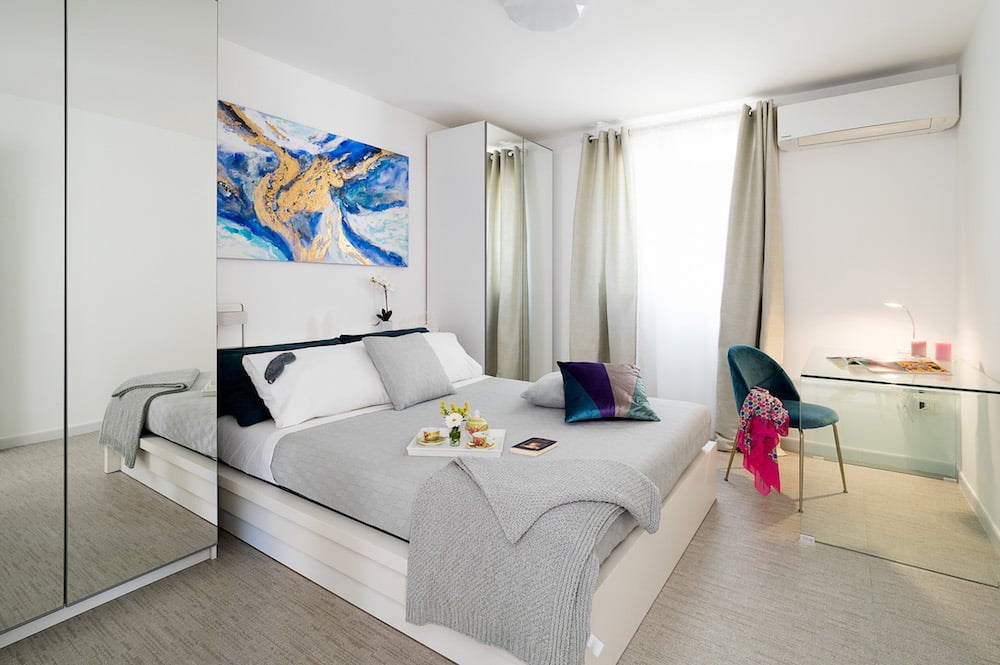 - De tweede slaapkamer is voorzien van een tweepersoonsbed, een bureau, en een kledingkast.