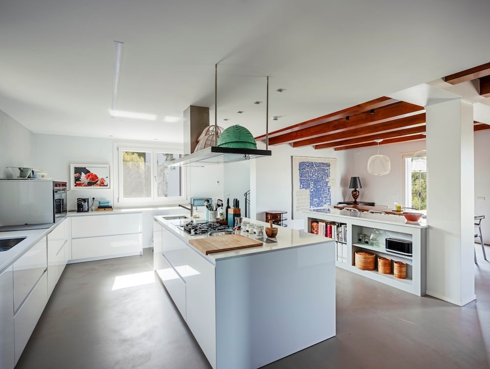 - Ruime, semi-professionele keuken met centraal kookeiland en bar, waar gasten kunnen zitten terwijl anderen in de keuken bezig zijn. De keuken is uitgerust met: koffie- en theezetapparaat, gasfornuis & inductiekookplaat, traditionele oven, stoomoven, magnetron, yoghurtmaker, broodrooster, Kitchenaid keukenmachine, spiralizer, rijstkoker, slowcooker, vaatwasser, koelkast, vriezer en ander kookgerei.