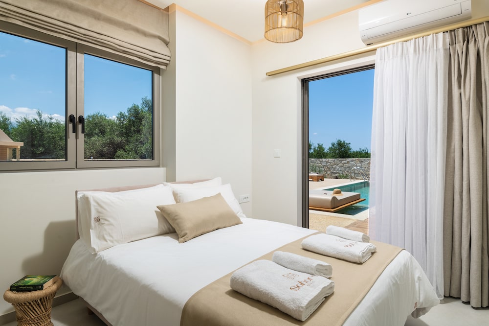 - Een slaapkamer met een tweepersoonsbed (140x200cm) met Coco-Mat matrassen en een eigen badkamer met een wastafel, toilet en inloopdouche. De slaapkamer heeft toegang tot het terras en zwembad.