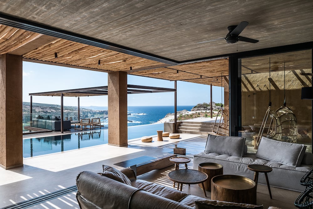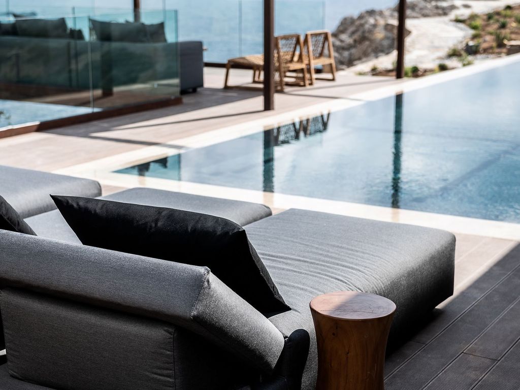 Rotsformaties, groene planten, en blauwtinten creëren een serene sfeer om in alle rust te genieten van de luxe outdoor faciliteiten.