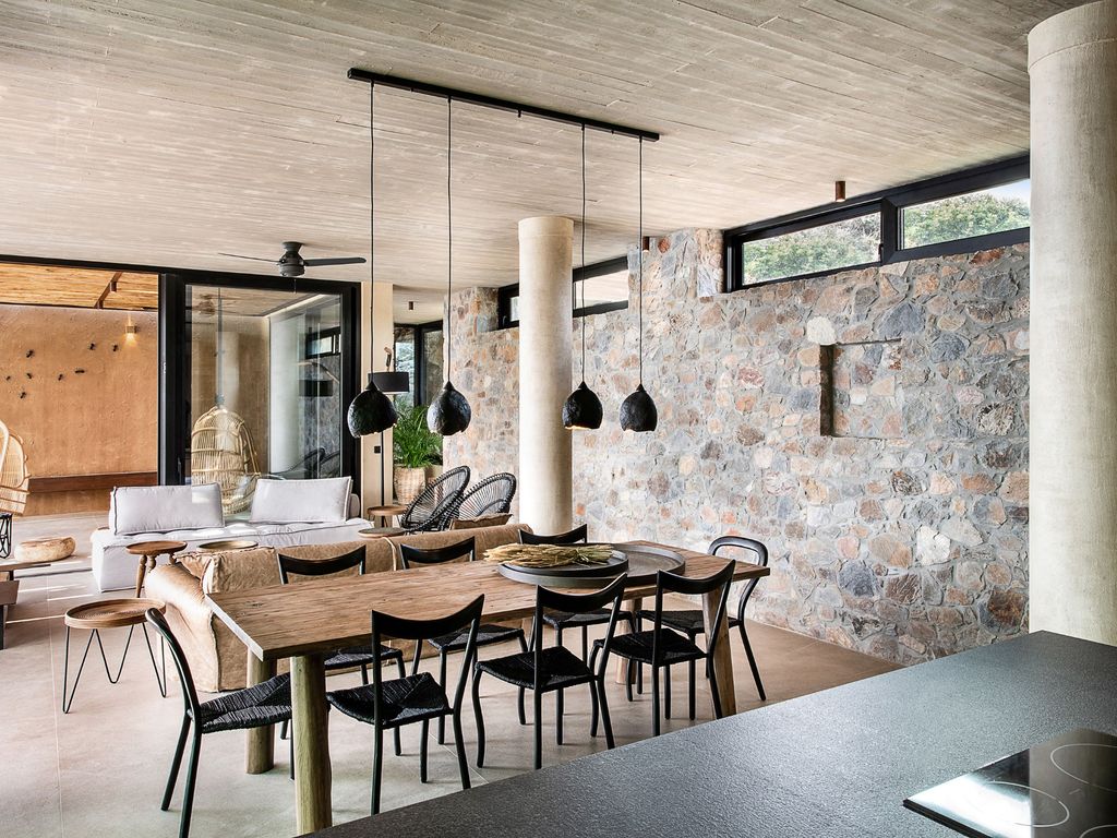 De gelijkvloerse villa wordt gekenmerkt door open ruimtes met grote glazen deuren en ramen die de grenzen met de natuur vervagen en waanzinnige uitzichten biedt over het schilderachtige landschap.