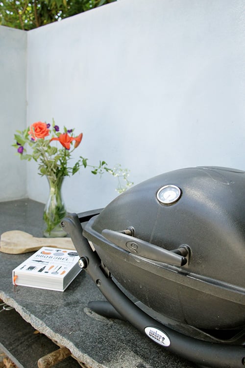 - Groot terras met eettafel, parasol, Weber BBQ, houtkachel