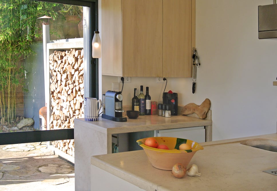 - Open keuken met kookeiland, u kunt bijvoorbeeld op 3 manieren koffie zetten o.a. Nespresso, ook liggen er fijne kookboeken. Het keukengedeelte heeft mooie marmeren aanrechtbladen en een prachtige berken-houten servieskast. Via de grote schuifdeuren komt u in de buitenkeuken op het terras.