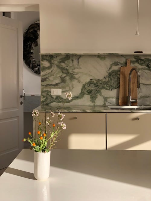 - Volledig uitgeruste keuken met marmeren werkblad en achterwand voorzien van een Sage koffiemachine, 2 koelkasten, oven, gas kookplaat, mixer, waterkoker en vaatwasser