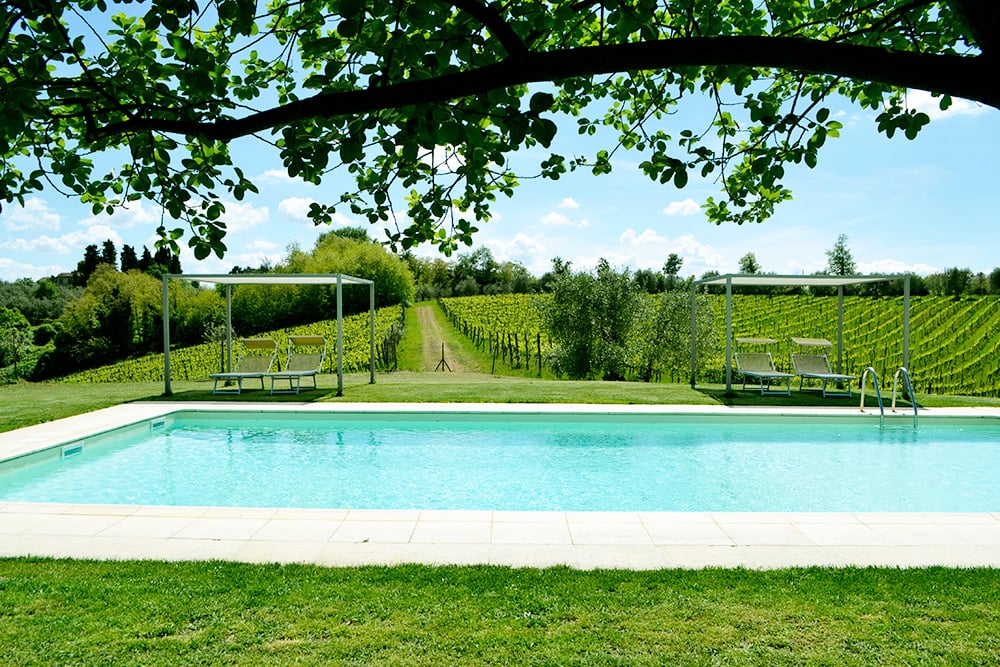 Buiten in de tuin heeft u een comfortabele zithoek uitgerust met kussens onder een pergola in de schaduw van jasmijn. Binnen een paar stappen bereikt u het prive zwembad (6 x 12 meter), omgeven door gras en twee pergolas voor de schaduw. Er staan voldoende ligstoelen en u heeft er mooi uitzicht over de naburige wijngaarden.