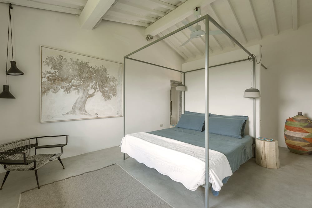 - Tweepersoons slaapkamer voorzien van een hemelbed, een stoel bedekt met vintage nautisch touw, een walk-in kast achter het bed en nachtkastjes gemaakt van boomstammen.